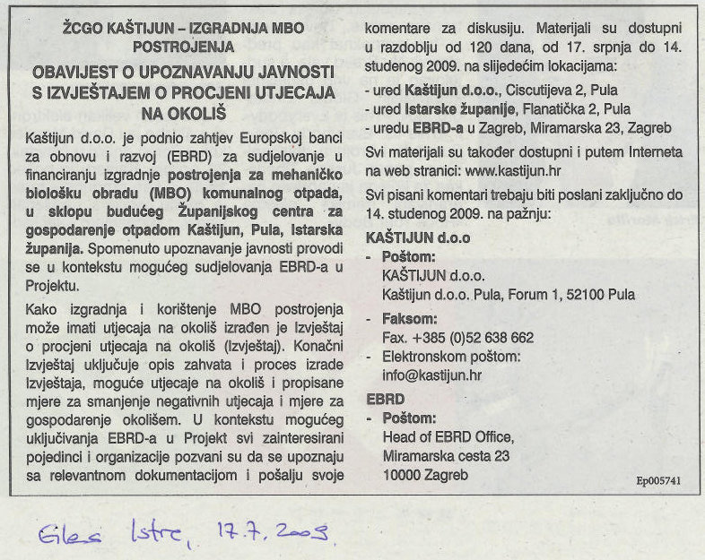 Stoga je tvrtci Kaštijun d.o.o - investitoru u Županijski centar za gospodarenje otpadom i postrojenje za obradu otpada na lokaciji Kaštijun, za koji je zatražen zajam, banka naložila dodatnu javnu raspravu o projektu u trajanju od 120 dana. Radi se o prvom postupku te vrste u Hrvatskoj.