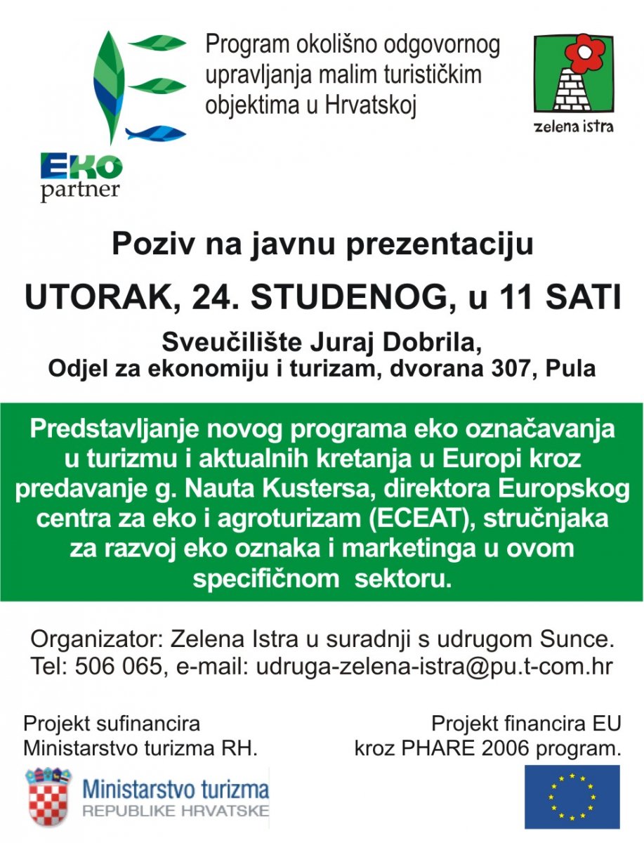 Pozivamo vas na predstavljanje našeg novog programa eko označavanja u turizmu i aktualnih kretanja u Europi kroz predavanje Nauta Kustersa,direktora Europskog centra za eko i agro turizam (ECEAT), stručnjaka za razvoj eko oznaka i marketinga u ovom specifičnom sektoru.