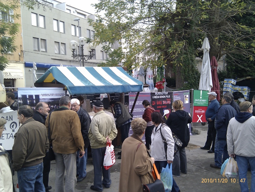 U subotu 27.11.2010. i još dvije subote nakon toga članovi i članice inicijative građana koji traže obustavu izrade štetnog UPU-a "Lučica Delfin" na pulskoj tržnici će od 9 do 14 prikupljati potpise građana za zahtjev za izmjenom GUP-a grada Pule za područje "Lučica Delfin".